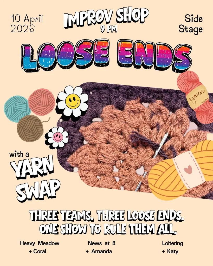 Cassie EmaLOOSE ENDS RETURNS!!!!! That's right!! Loose Ends is returning for a SECOND time to the Improv Shop Sidestage on April 10th at 9pm!! How will these solo improvisers be woven into these already established teams? How will the already established teams alter their form to include their newest loose end? What will we see at the Yarn Swap!? Get yourself a trustworthy friend to text you Cagematch updates and head on down to Sidestage! Heck, if you want, we will even share the results of Cagematch if they're announced before the end of our show! We're here to please! Teams and solo improvisers - please check your email for more information! ❤ See you THERE!!!!!! @JPQqGCGS @newsateight @vKc-9Khz