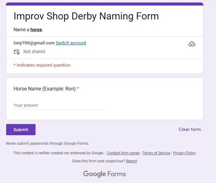 Many have been asking me about the horses racing in the Inaugural Improv Shop Derby. They say "Charles! What are the names of the steeds that will be partaking in this incredible event?" The answer is that I don't know yet because I'll picking from your name submissions. Here's the form: https://docs.google.com/forms/d/e/1FAIpQLSepU9SYrsbjKE5er-po4zXM3Sy7tK4yQsWiL4nfBjoVq3SSjA/viewform