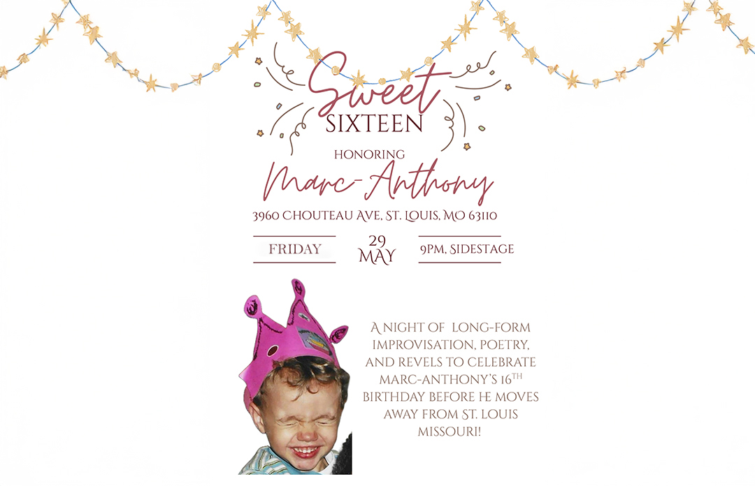 Join Marc-Anthony and friends to celebrate his 16th birthday before he leaves STL at the end of July. Marc-Anthony will be reading poetry composed between the ages of 5 and 15, and in an Armando style, he and his fellow improvisers will perform scenes! He misses you already.